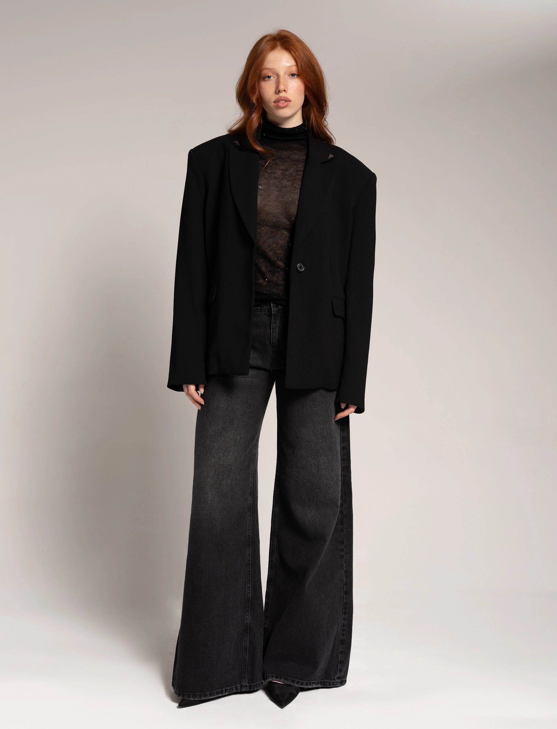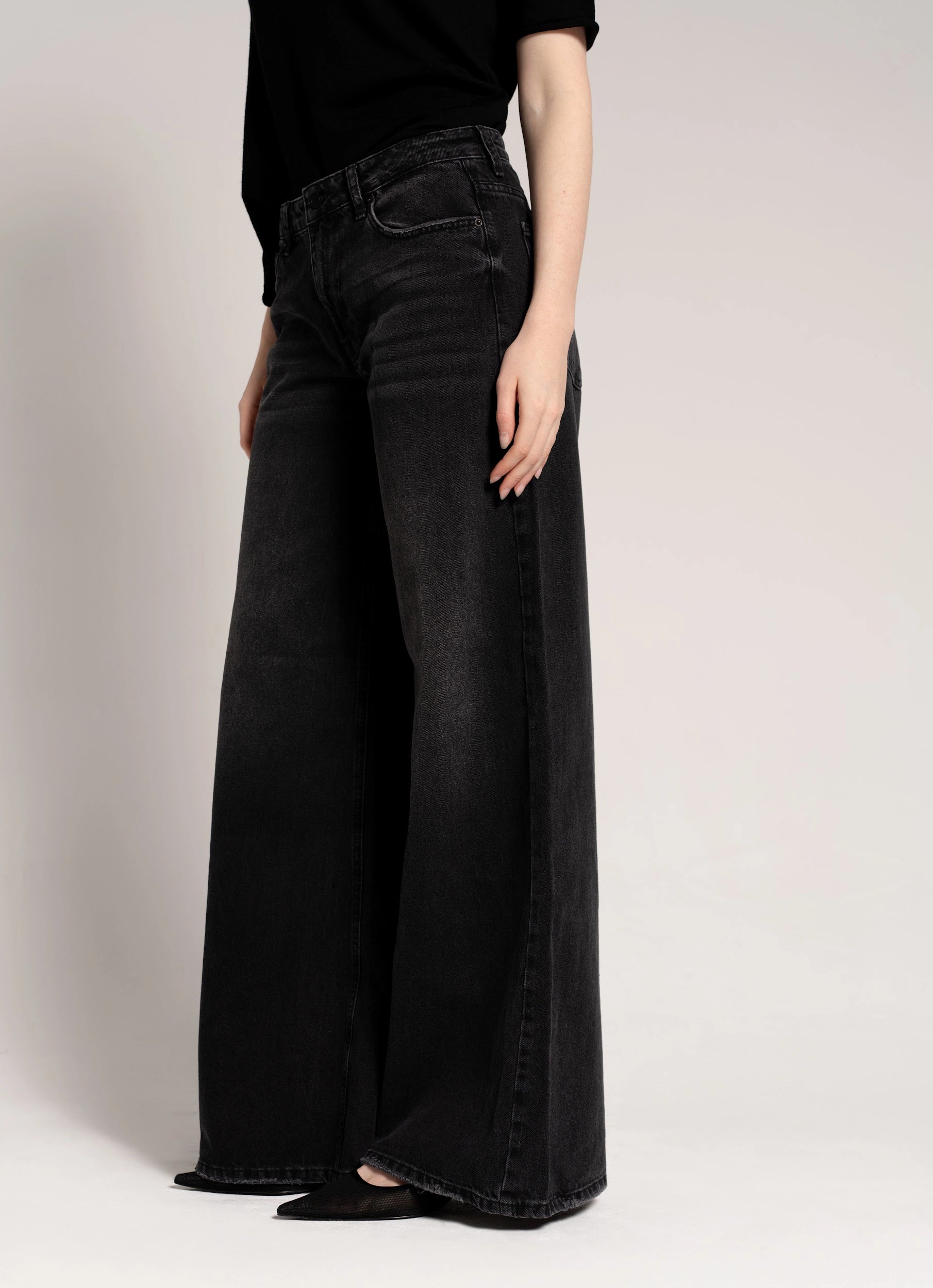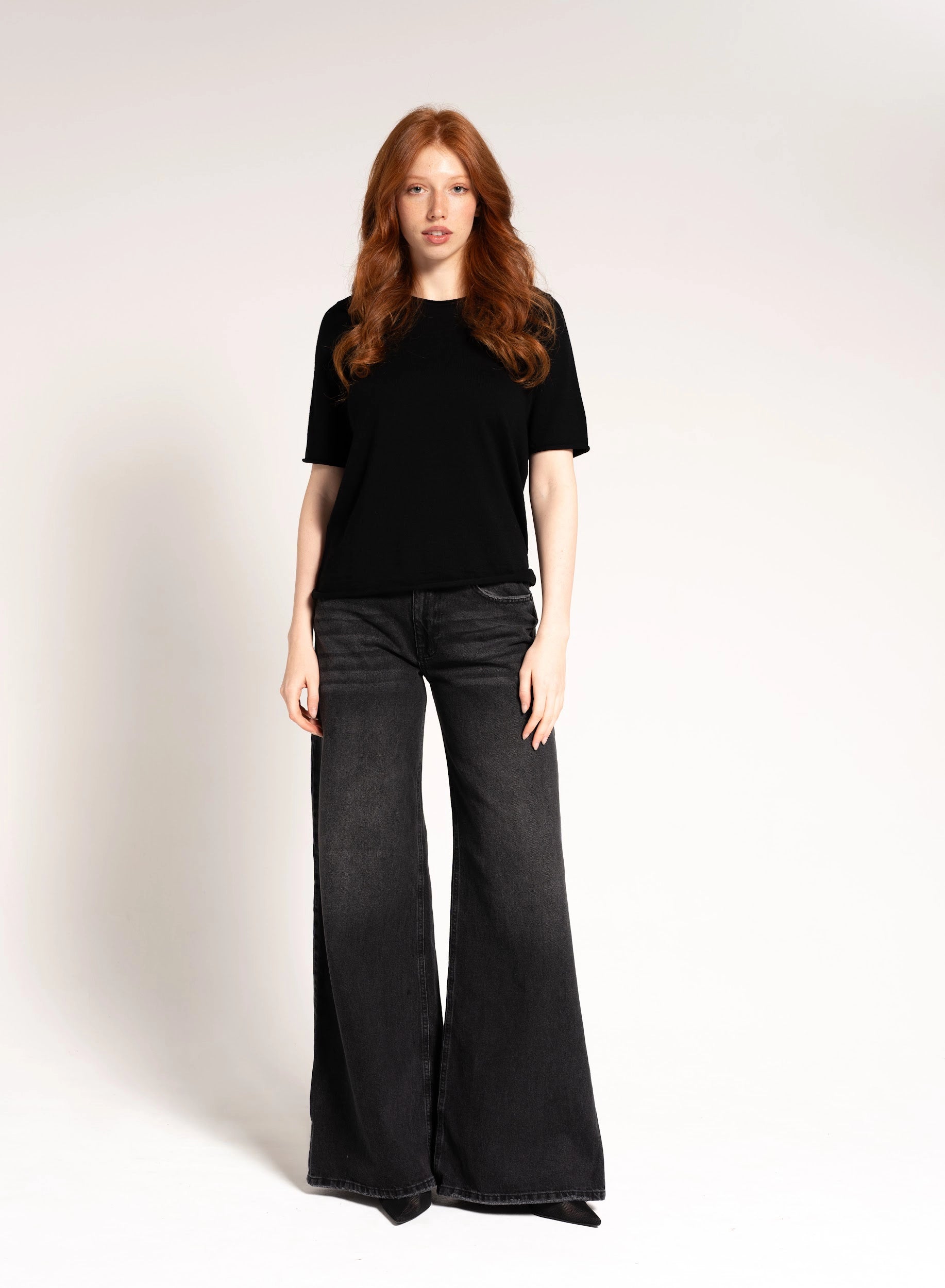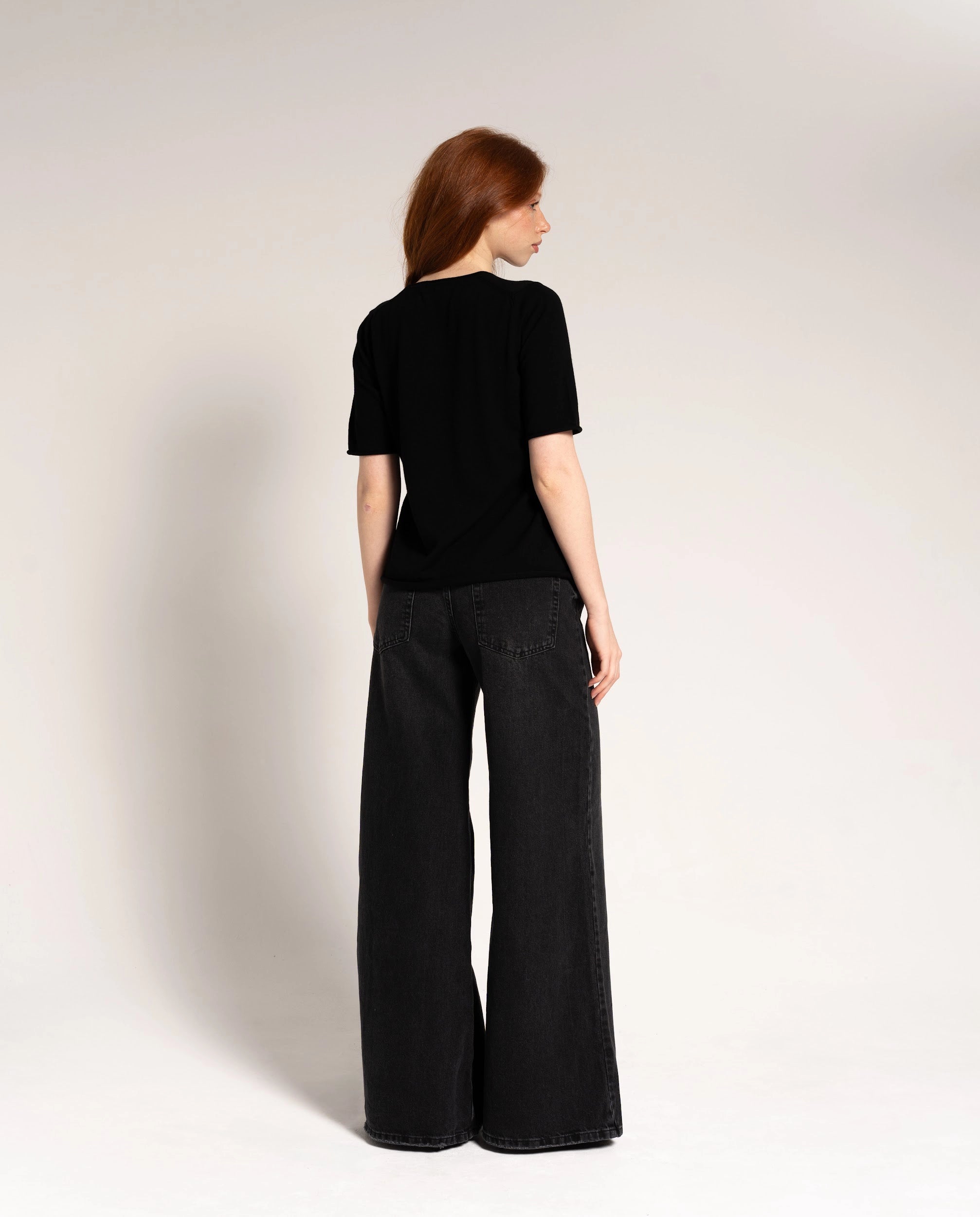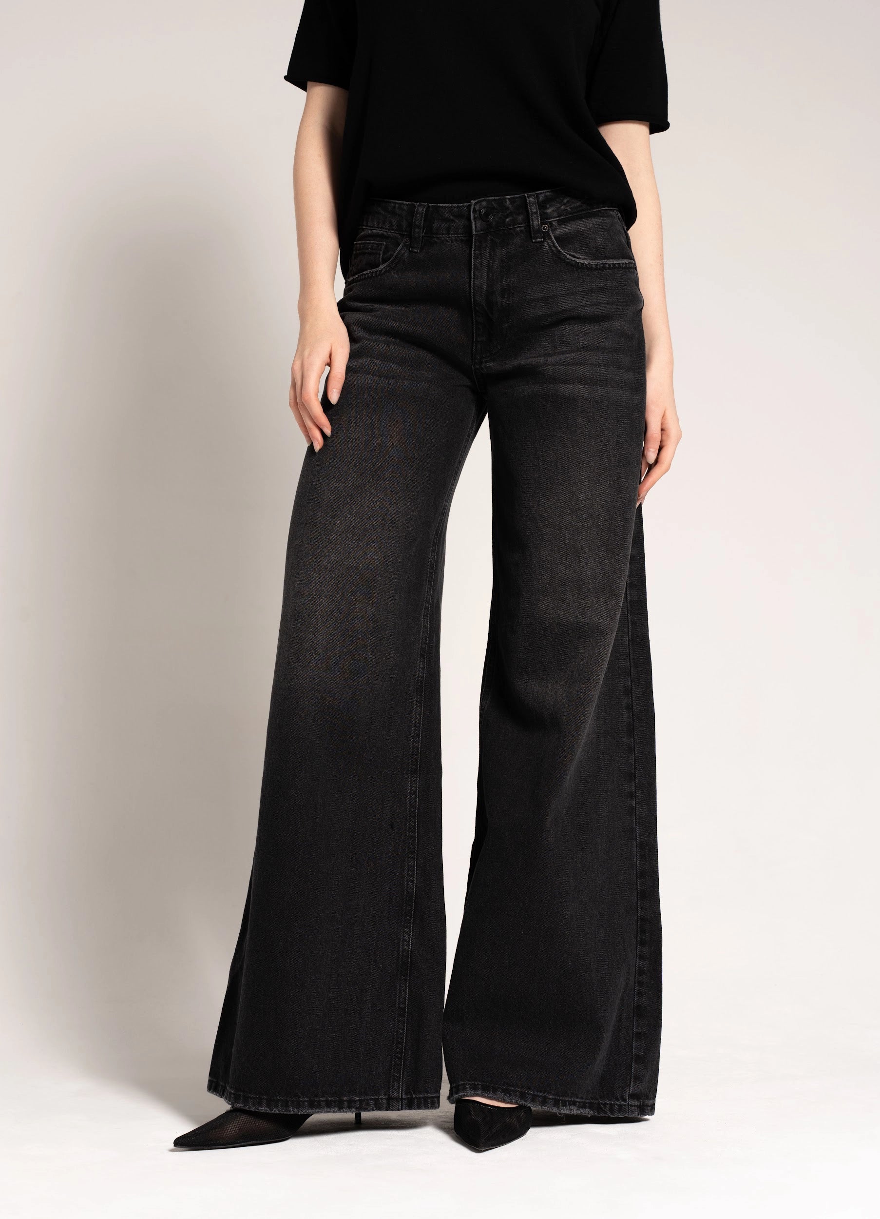 A timeless wide-leg cut meets a medium-rise waist in these versatile jeans. Crafted from premium heavyweight denim, their structured silhouette flatters the figure while offering everyday ease. The subtle faded black wash adds depth, making them an effortless pairing with everything from a fitted top to a relaxed knit.