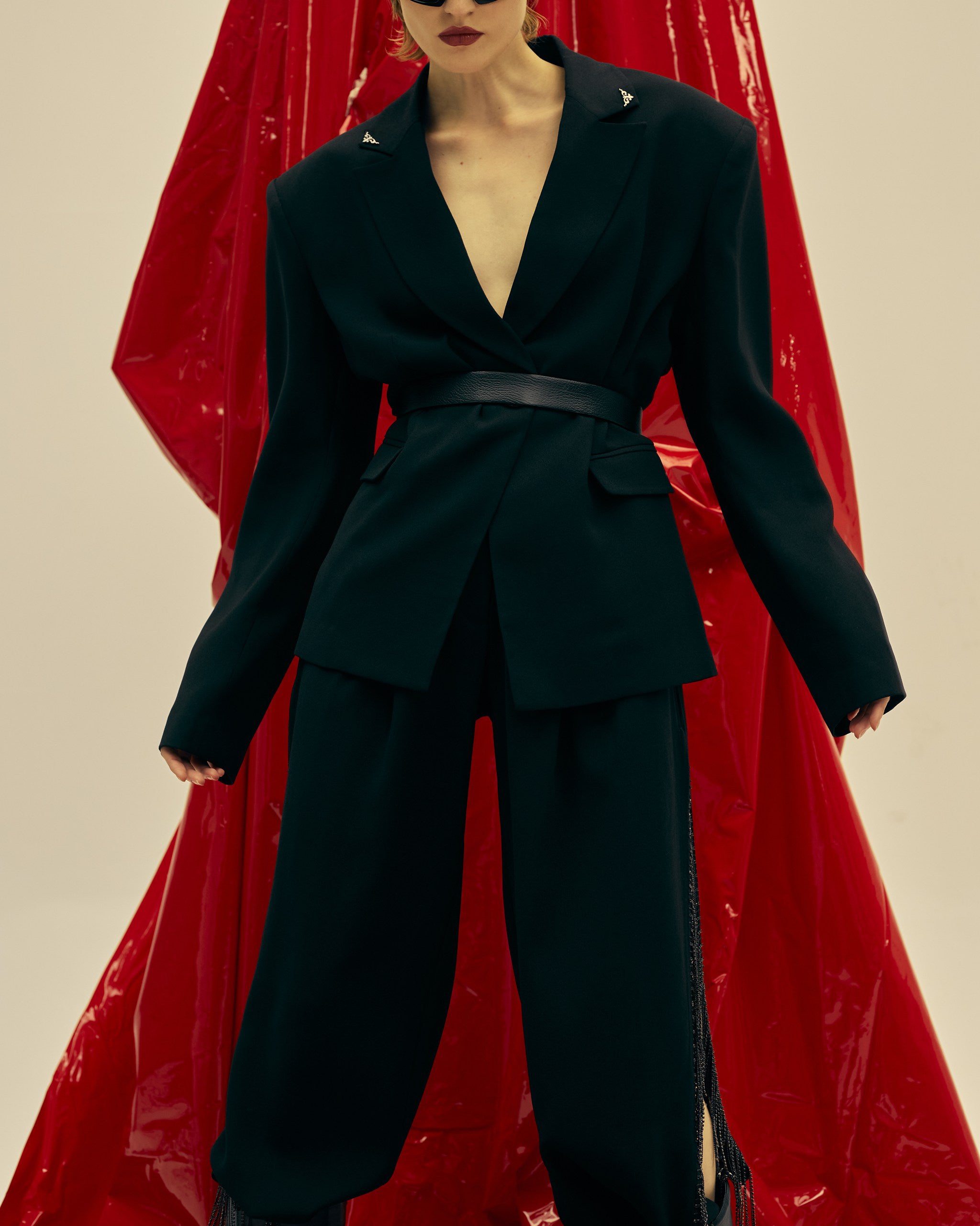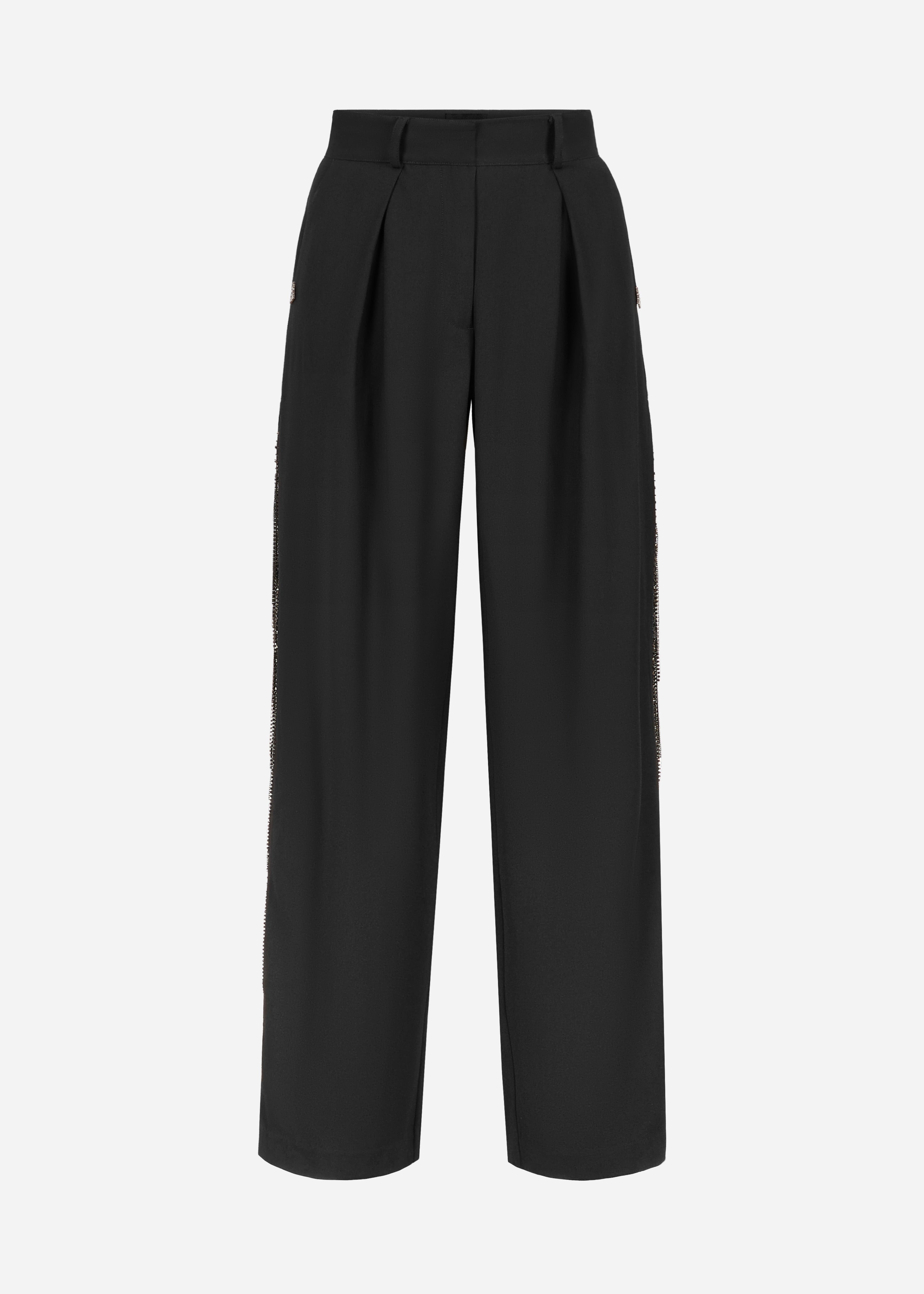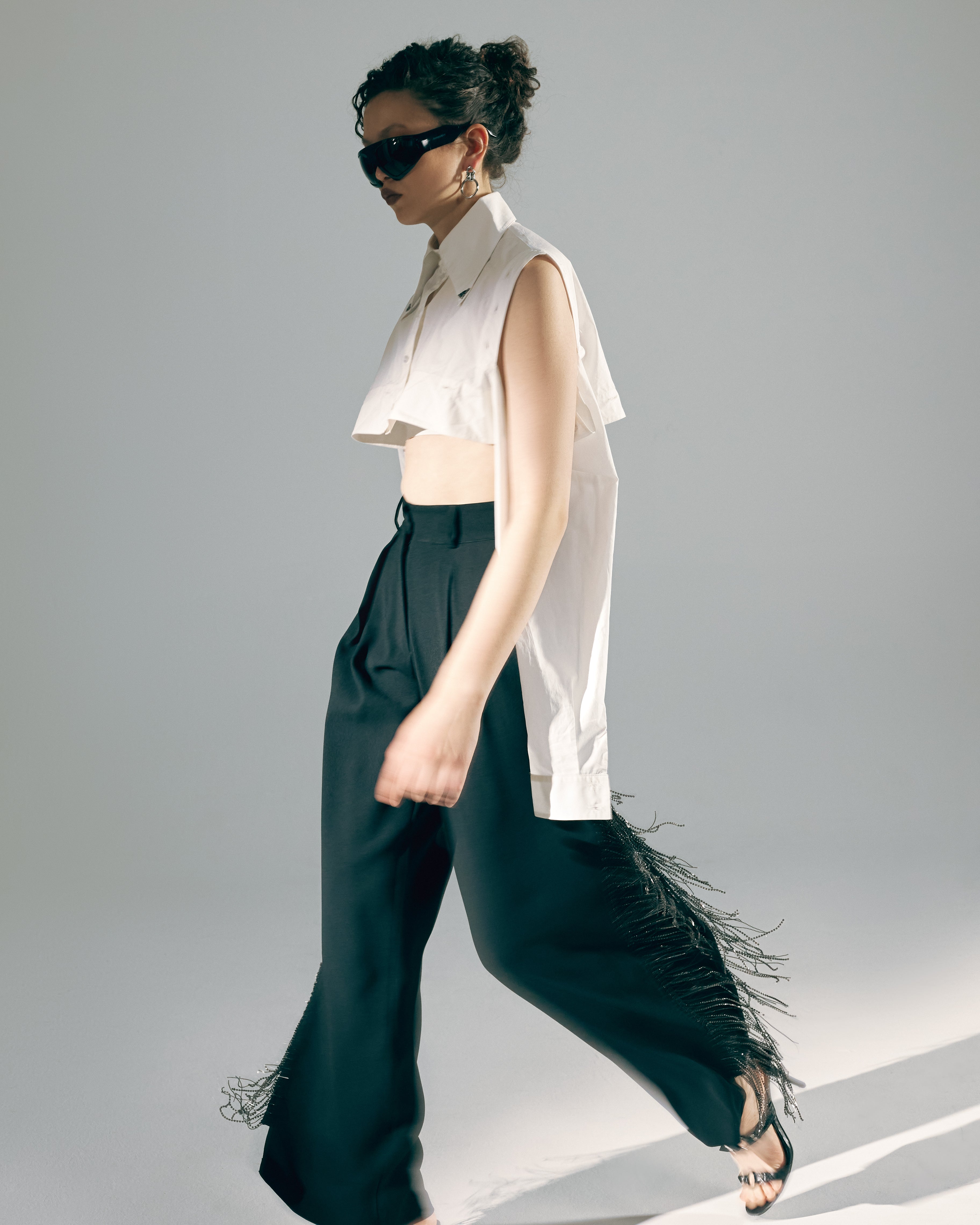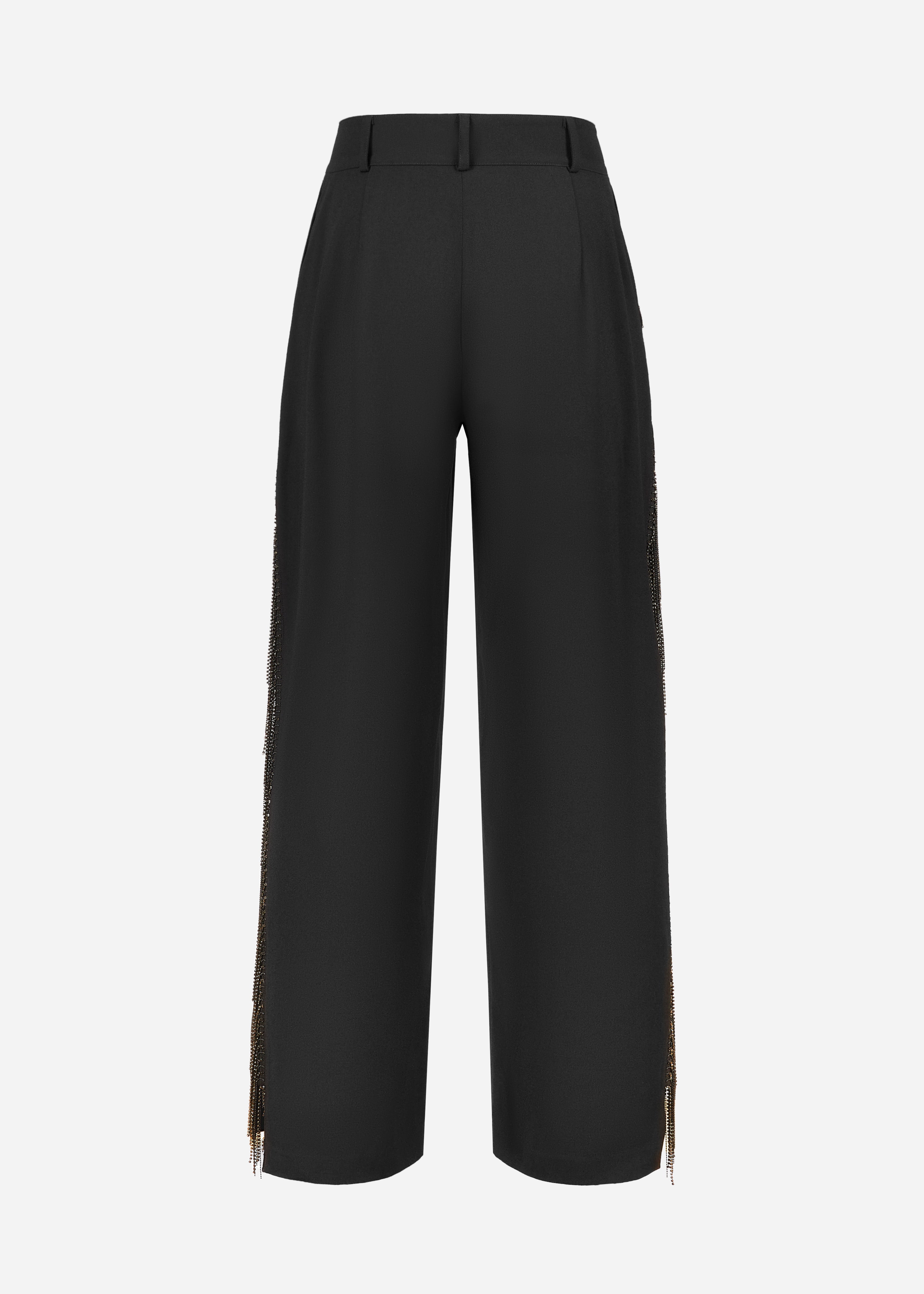 Celeste Trousers feature a high-waisted, straight-leg design with side slits and delicate fringe detailing. Featuring practical pockets, they combine comfort and functionality seamlessly.